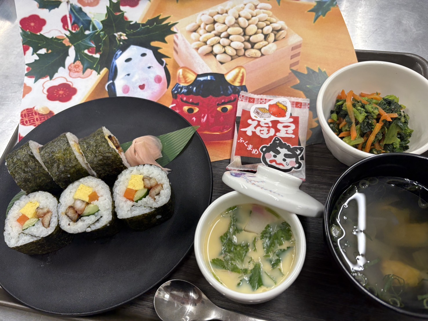 - 季節の料理:お正月は「お雑煮とおせち料理」で新年を祝います。節分には巻きずしなど、クリスマスには、サンタとトナカイに扮して入院患者さんの病室に伺い、手作りのケーキと紅茶をプレゼントしています。一緒に笑顔いっぱいの記念撮影をして楽しく過ごします。