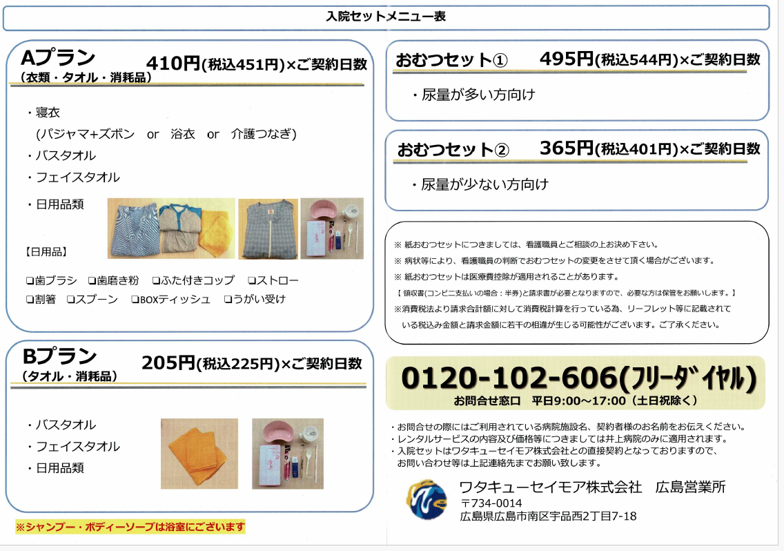 ・入院セットの申し込み契約書(必要な方のみ) --下記に入院セットの説明があります。- 入院セットを申し込まれない方は、洗面道具・下着・パジャマ・タオル・湯のみ・箸・スプーン・ティッシュ・ゴミ箱・スリッパなどや、