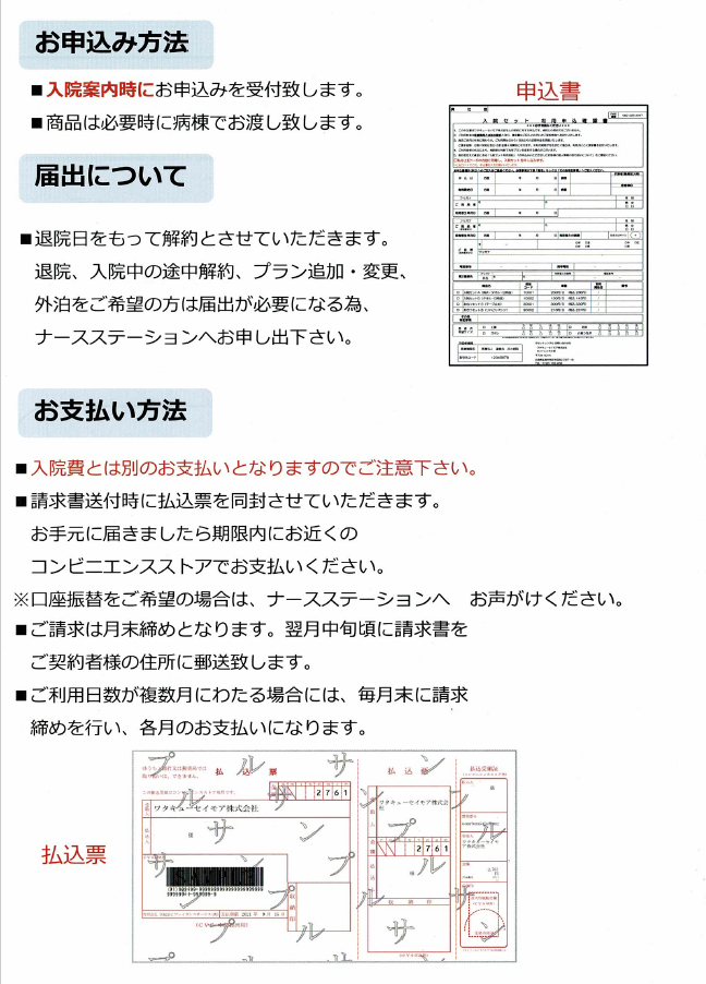 - 月途中で退院の時は、退院日当日精算し請求書をお持ちしますので、当日支払いを済ませてから退院して下さい。